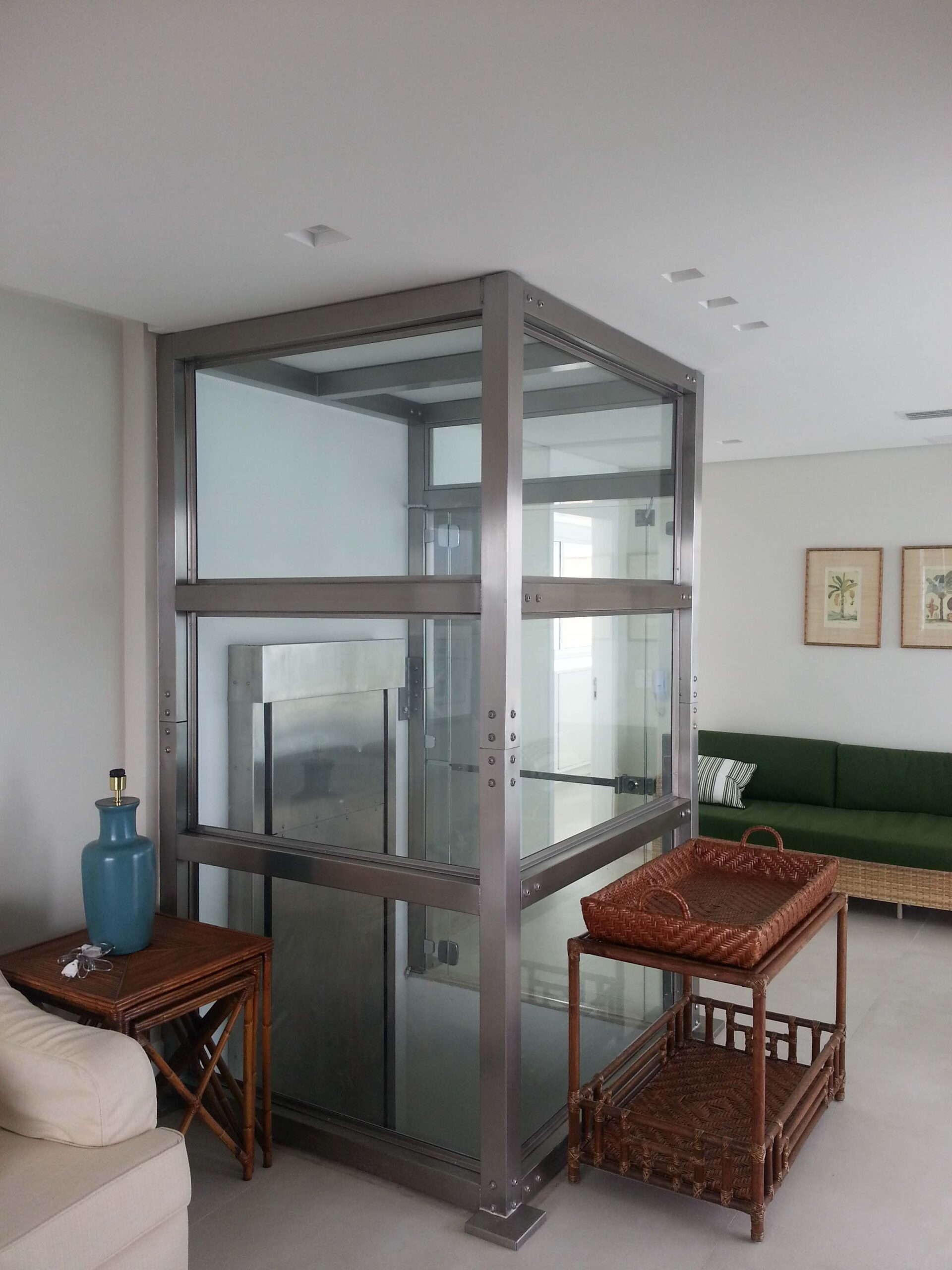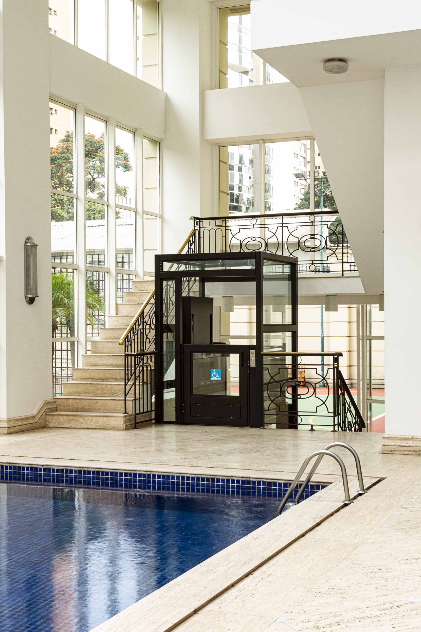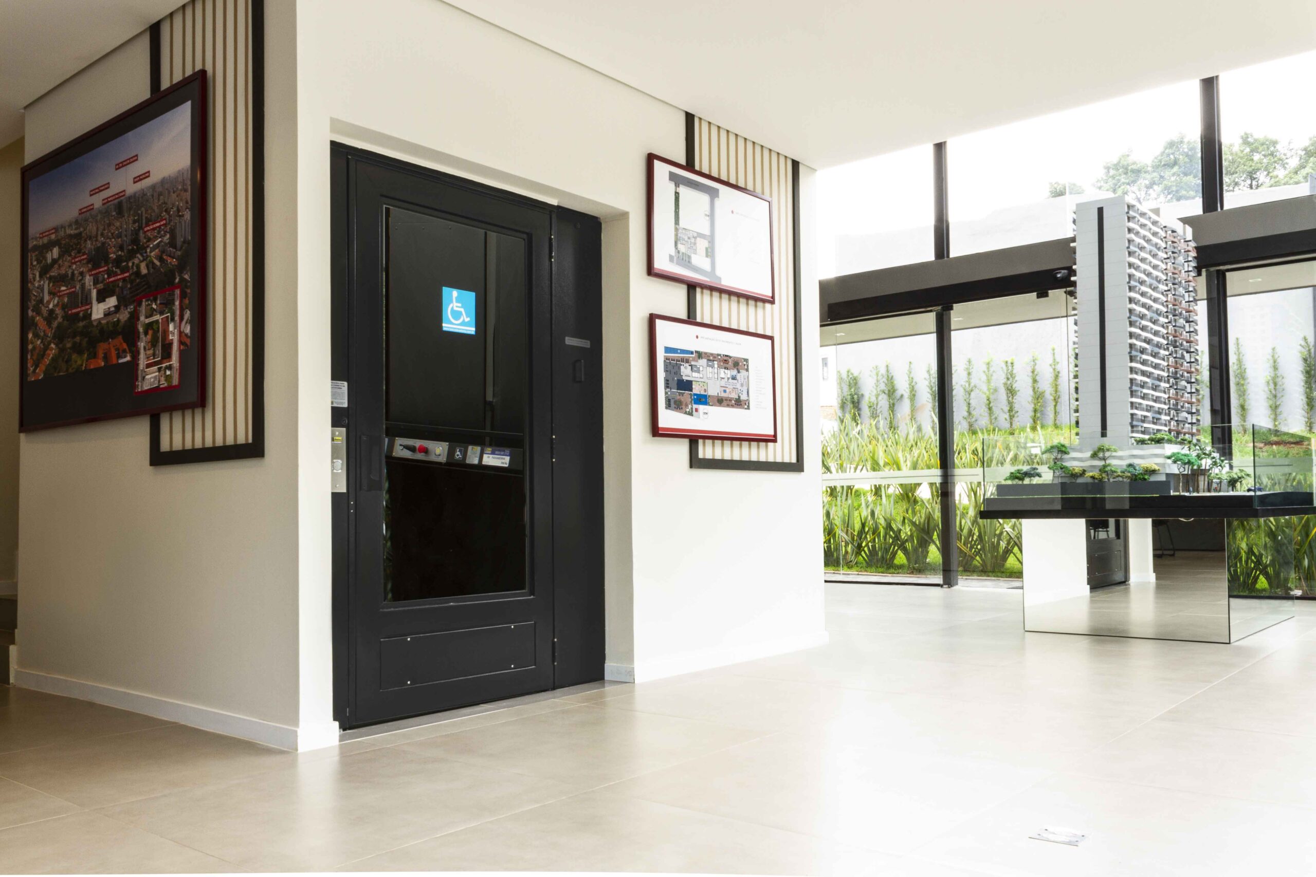 “A plataforma cabinada é uma opção intermediária entre a plataforma padrão e o elevador. Ela possui uma cabine fechada com 2,10m de altura, teto e iluminação artificial, oferecendo maior conforto e segurança. Além disso, pode ser equipada com portas de abertura lateral, transformando-se em uma solução semelhante a um elevador residencial.”