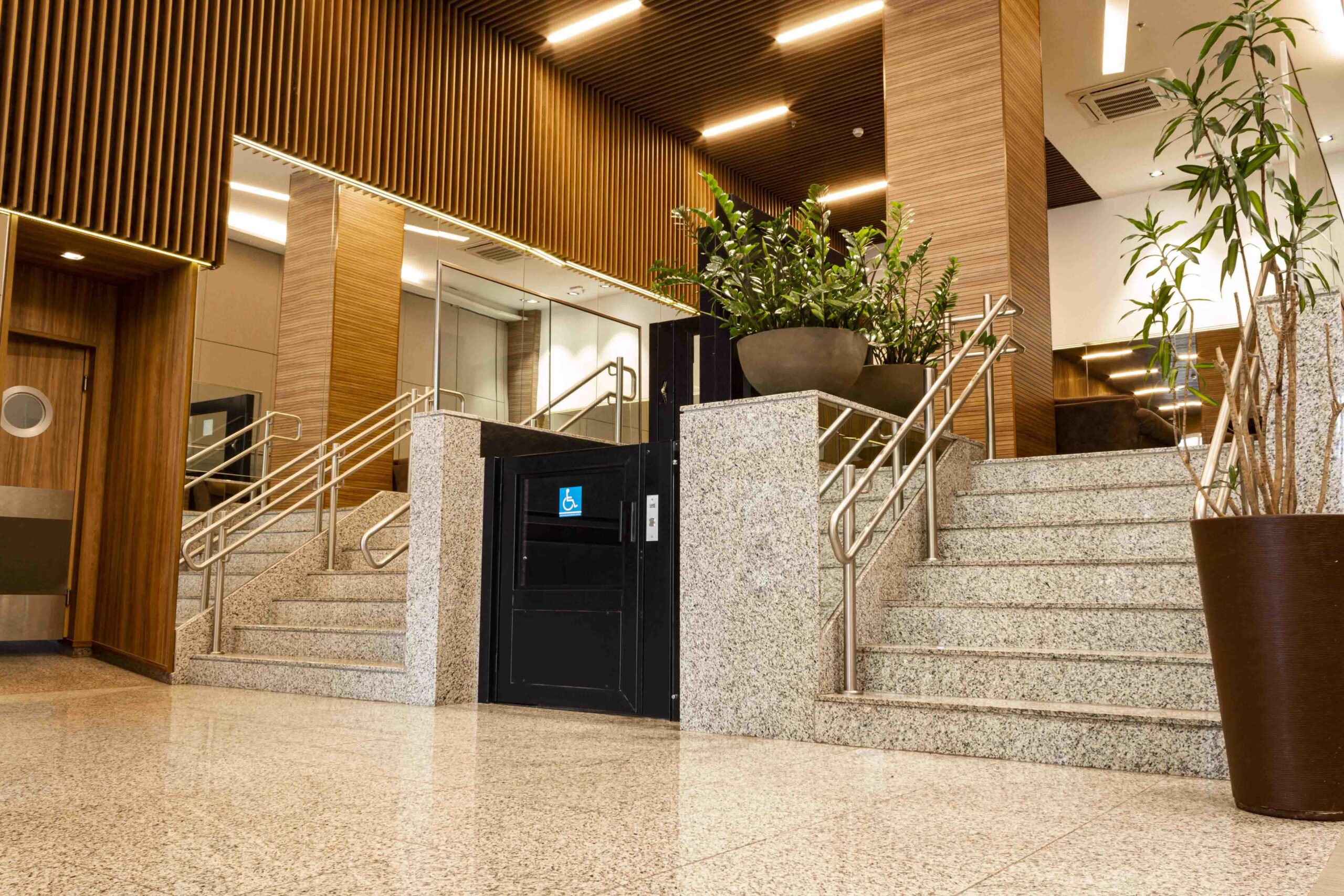 “A plataforma cabinada é uma opção intermediária entre a plataforma padrão e o elevador. Ela possui uma cabine fechada com 2,10m de altura, teto e iluminação artificial, oferecendo maior conforto e segurança. Além disso, pode ser equipada com portas de abertura lateral, transformando-se em uma solução semelhante a um elevador residencial.”